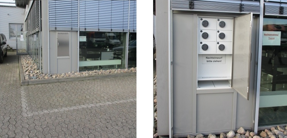 Mit Annahme- und Ausgabesystemen können Autohäuser, Autovermietungen und Nutzfahrzeugzentren ihren Kunden einen echten und vor allem sicheren 24-Stunden-Service bieten, da die Systeme den diebstahlsicheren Austausch von Fahrzeugschlüsseln, Papieren und anderen Unterlagen außerhalb der Öffnungszeiten gewährleisten. Annahme- und Ausgabetresore bestehen aus einem Einwurffach, in das der Kunde seinen Fahrzeugschlüssel mit oder ohne Auftragstasche einwirft, sowie aus einzelnen Wertfächern, die jeweils mit einem eigenen Hochsicherheits- Elektronikschloss ausgestattet sind. Ist das Fahrzeug abholbereit, kann der Kunde „sein“ Fach mit einem Code öffnen, den Sie ihm z. B. per SMS oder telefonisch zugewiesen haben. So kann er sein Fahrzeug unabhängig von Ihren Öffnungszeiten abholen. Annahme- und Ausgabesysteme sind in unterschiedlichen Größen und Sicherheitsstufen erhältlich. Sie können entweder in die Gebäudewand integriert (bitte beachten Sie das diese Ausführungen vor Witterung und Wetter geschützt sein müssen!), oder freistehend im Außenbereich aufgestellt werden. In diesem Fall werden sie mit einer massiven Betonummantelung versehen, und eine Edelstahlabdeckung schützt die Wertfächer vor Witterungseinflüssen.